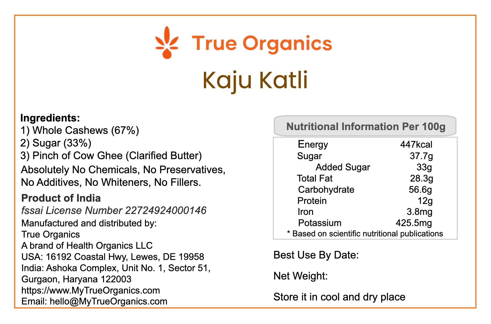 - Our Kaju Katlis are made with only three ingredients: 1) Premium and whole cashews (67%), 2) Sugar (33%), 3) Pinch of ghee (clarified butter) - nothing else.