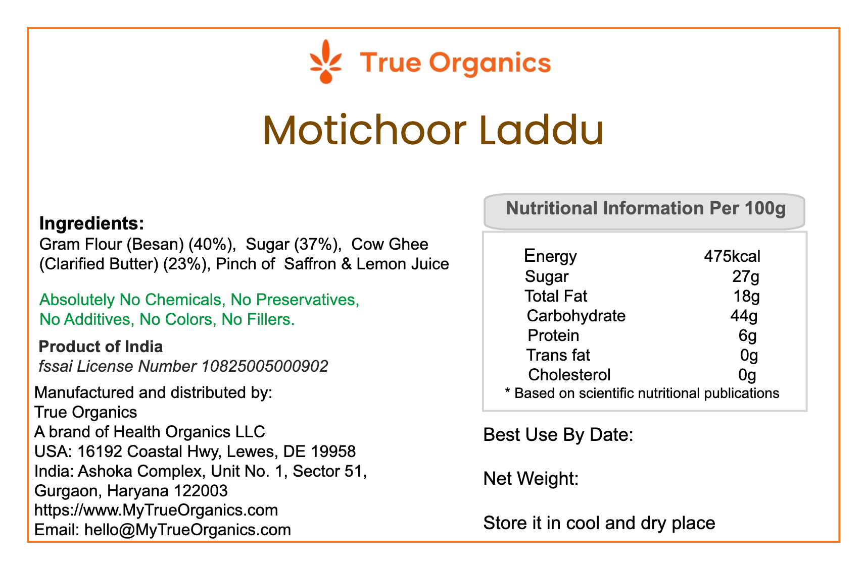 - Our Motichoor laddus are made with only three ingredients: 1) Gram Flour (Besan) (37%), 2) Sugar (40%), 3) Cow ghee (23%), enriched with saffron - nothing else.
